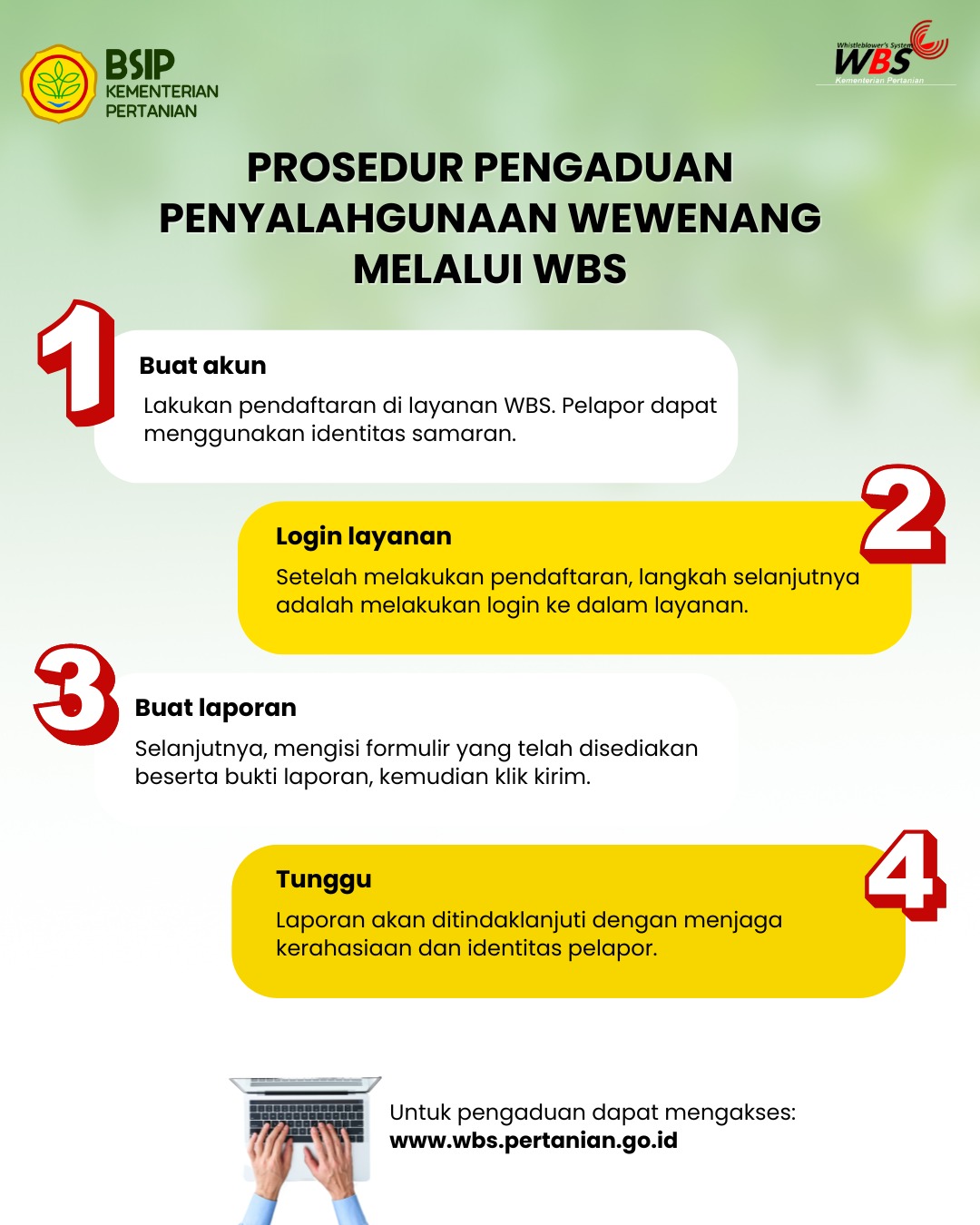 Kementerian Pertanian akan merahasiakan identitas pribadi Anda sebagai whistleblower karena Kementerian Pertanian hanya fokus pada informasi yang Anda laporkan.